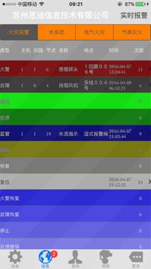 点击图2.3.1右上角的“实时报警”标签,将弹出当前接收到的实时报警信息列表,如图2.3.5所示。当接收到实时报警时,在APP的Tab栏上的“设备”或者“信息”上将显示如图2.3.6所示的报警记录条数,设备上显示的数字表示有发生过设备离线或者上线报警,如果是信息上显示数字表示有发生过火警、故障等报警主机、水系统等的报警。
