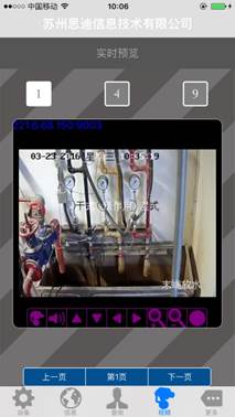 在此页面,用户可浏览所有相关的摄像头视频,点击1,、4、9按钮可在控制页面内显示的摄像头视频数,点击上一页和下一页可切换摄像头。